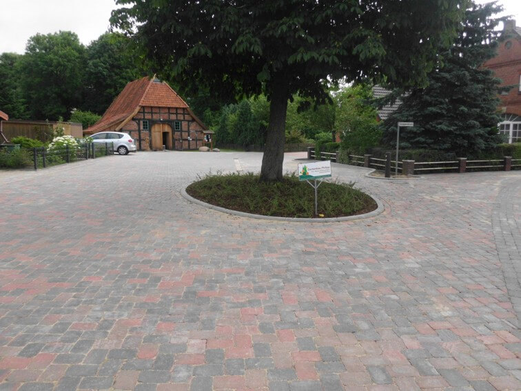In der Ausführung wurde rund um die kleine vorhandene Bauminsel sogenanntes gerumpeltes Pflaster verlegt sowie einige Parkplätze für die Anwohner geschaffen. Grünflächen sollten aufgrund der späteren Pflege vermieden werden. Der vom Dorfplatz abgehende Stichweg wurde ebenfalls in Pflasterbauweise mit gerumpeltem Pflaster ausgebaut.