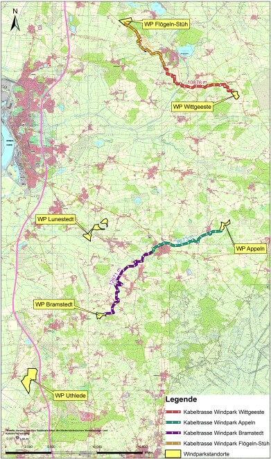 Die Energiekontor AG plant den Neubau von mehreren Windparkanlagen im Landkreis Cuxhaven. Es handelt sich hierbei um die Windparks „Flögeln-Stüh“, „Wittgeeste“, „Lunestedt“, „Bramstedt“, „Appeln“ und „Uthlede“. Innerhalb der Windparks werden durch die geplanten Zufahrten zu den Windenergieanlagenstandorten und durch die Kabeltrasse zum jeweiligen Anschlusspunkt des Stromleitungsnetzes einige Gewässer, Gräben, Straßen/Wege, Bahntrassen und ggf. sonstige Leitungstrassen gekreuzt.